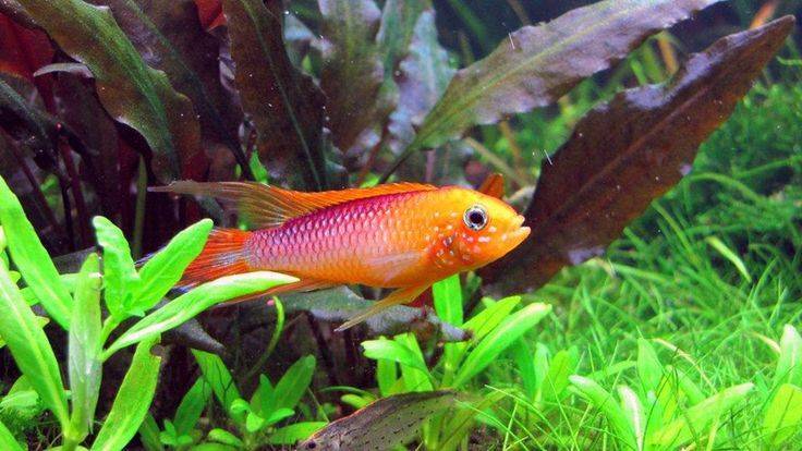 Апистограмма Агассица Огненно красная выделяется ярко-красным оперением плавников и стройным телом. Этот вид требует чистой воды с хорошей фильтрацией и предпочитает аквариумы, густо засаженные растениями, где рыбки могут обустроить свои территории.