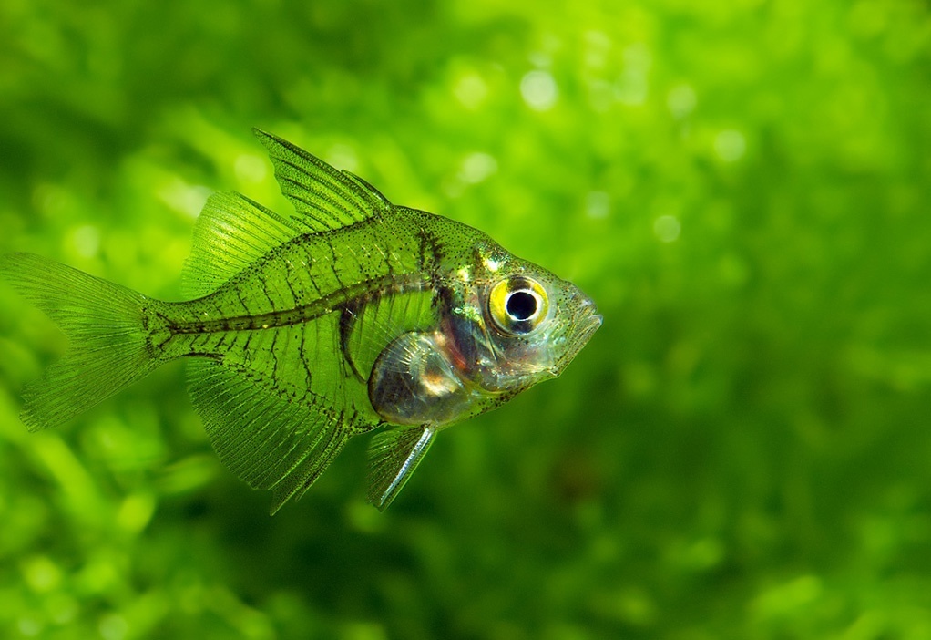 Стеклянный окунь обладает уникальным прозрачным телом, сквозь которое просматривается скелет, что делает его необычным обитателем пресноводного аквариума. Этот стайный вид предпочитает мягкую воду и спокойных соседей, создавая завораживающий визуальный эффект в акваскейпе.